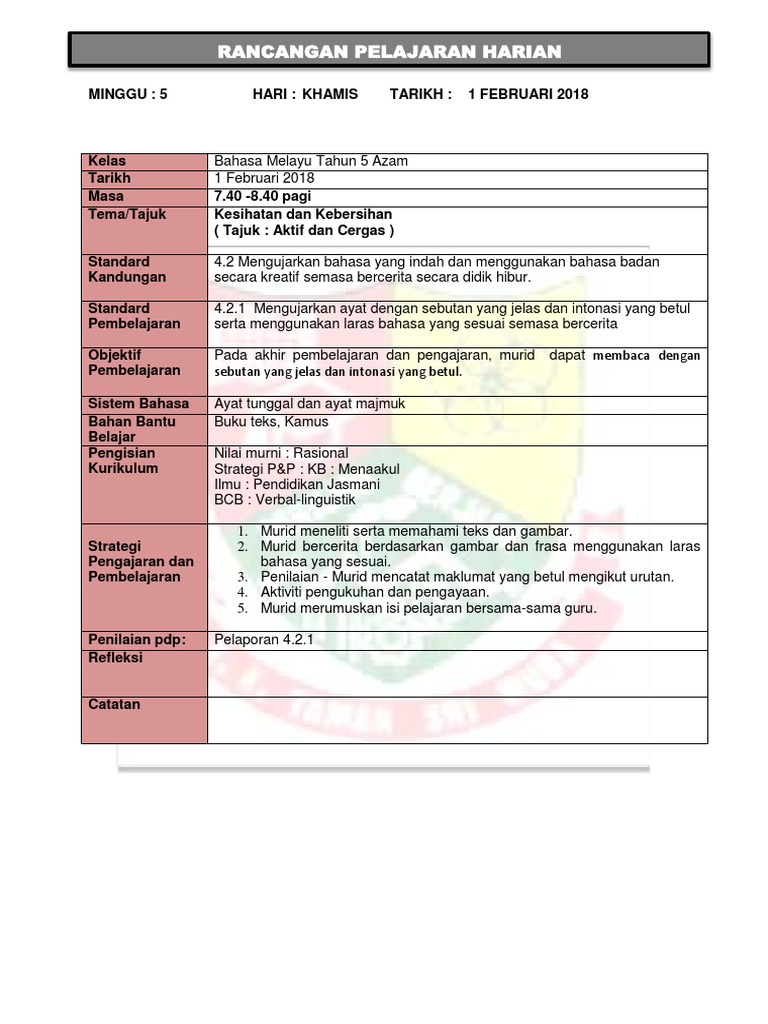 RPT 2018 Tahun 1 Subjek Bahasa Melayu January 3 2018 November 3 2018 by Tcer Mai 887 views. Rancangan pengajaran harian merupakan satu rekod khas yang disediakan oleh guru sebelum menjalankan sesi pengajaran dan pembelajaran di sekolah. RANCANGAN PENGAJARAN HARIAN BAHASA MELAYU TAHUN 5 1.
